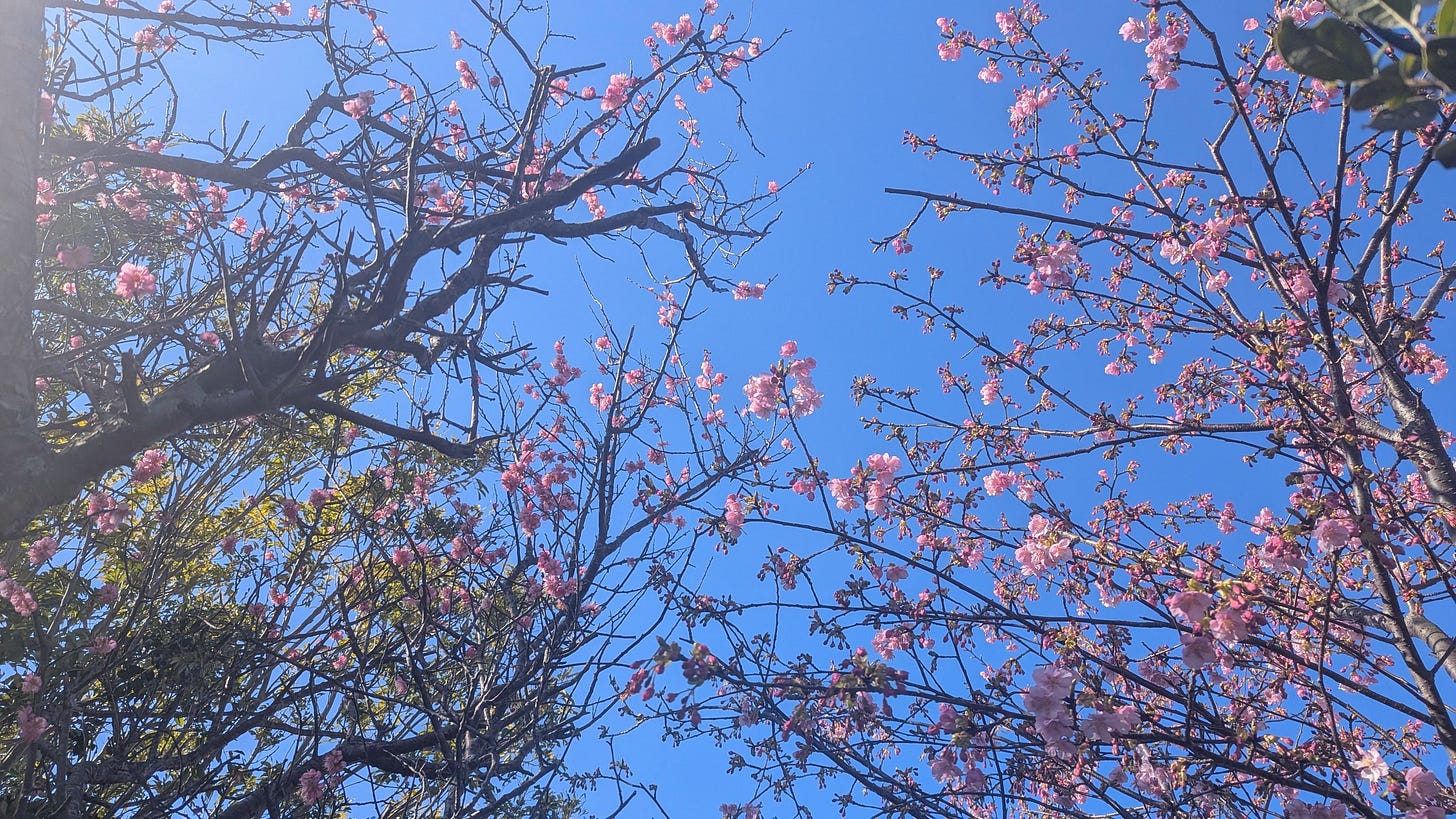 And after so many weeks of relative silence – after the soft chirps of late-autumn insects were a faded memory and only the stark echo of crows punctuated wintry afternoons – new voices have returned in the form of tiny squeaks from little birds called mejiro. They’re named after the white rings around their eyes, which make their lime-green feathers look even more vivid. These curious guys arrived just in time for those pink blossoms, whose nectar is their favorite snack.